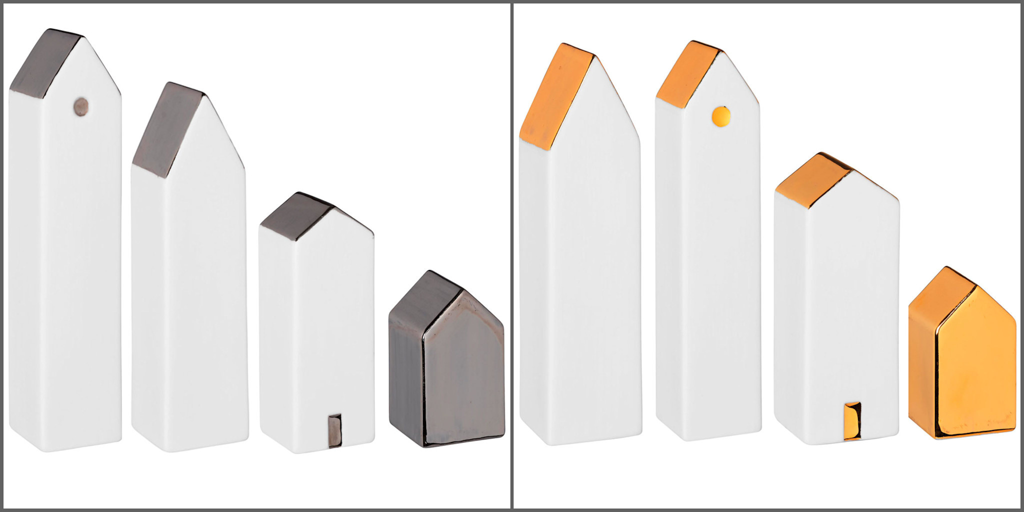 Set aus vier teils weißen, teils silbernen Häuschen aus unglasiertem, handbemaltem Porzellan mit Höhen von 6 - 15 cm.